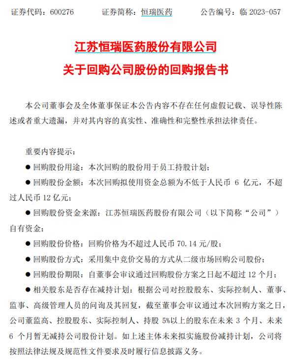 5月18日晚間,“藥茅”恒瑞醫(yī)藥公告稱,將以自有資金通過集中競價交易方式回購公司股份用于員工持股計劃,回購總金額不低于6億元、不超過12億元,回購價格不超過人民幣70.14元/股。目前該股總市值為3063億元。