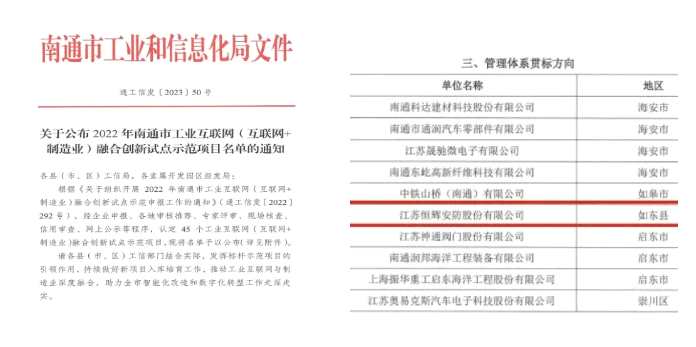 熱烈祝賀!南通市工業(yè)和信息化局發(fā)文公布2022年南通市“工業(yè)互聯(lián)網(wǎng)(互聯(lián)網(wǎng)+制造業(yè))融合創(chuàng)新試點(diǎn)項目”示范企業(yè)名單,恒輝安防(300952)成功入選管理體系貫標(biāo)類方向試點(diǎn)示范項目。