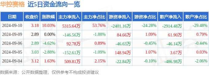 消息,華控賽格9月10日漲停收盤(pán),收盤(pán)價(jià)3.18元。該股于9點(diǎn)39分漲停,未打開(kāi)漲停,截止收盤(pán)封單資金為3539.0萬(wàn)元,占其流通市值1.11%。