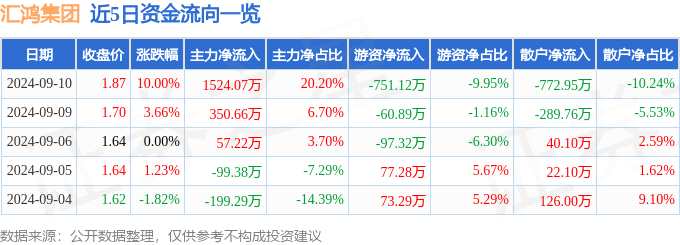 摘要: 消息,匯鴻集團(tuán)9月10日漲停收盤,收盤價(jià)1.87元。該股于9點(diǎn)33分漲停,1次打開(kāi)漲停,截止收盤封單資金為1178.19萬(wàn)元,占其流通市值0.28%。9月10日的資金流向數(shù)據(jù)方面,