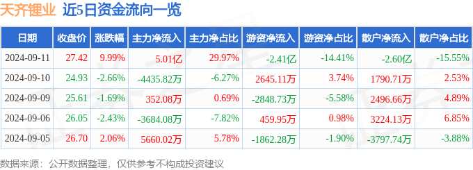 消息,天齊鋰業(yè)9月11日漲停收盤,收盤價(jià)27.42元。該股于10點(diǎn)4分漲停,未打開漲停,截止收盤封單資金為1.56億元,占其流通市值0.39%。