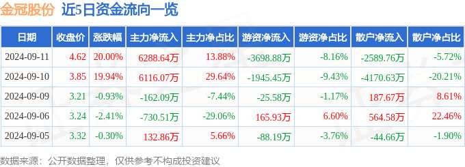 消息,金冠股份9月11日漲停收盤(pán),收盤(pán)價(jià)4.62元。該股于9點(diǎn)43分漲停,3次打開(kāi)漲停,截止收盤(pán)封單資金為5160.82萬(wàn)元,占其流通市值1.35%。