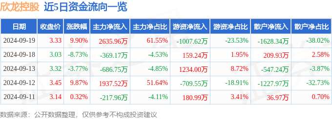 摘要: 消息,欣龍控股9月19日漲停收盤(pán),收盤(pán)價(jià)3.33元。該股于9點(diǎn)30分漲停,未打開(kāi)漲停,截止收盤(pán)封單資金為2542.12萬(wàn)元,占其流通市值1.42%。9月19日的資金流向數(shù)據(jù)方面,