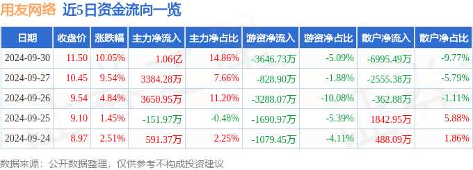 摘要: 消息,用友網(wǎng)絡(luò)9月30日漲停收盤,收盤價(jià)11.5元。該股于9點(diǎn)31分漲停,3次打開漲停,截止收盤封單資金為4676.1萬元,占其流通市值0.12%。9月30日的資金流向數(shù)據(jù)方面,