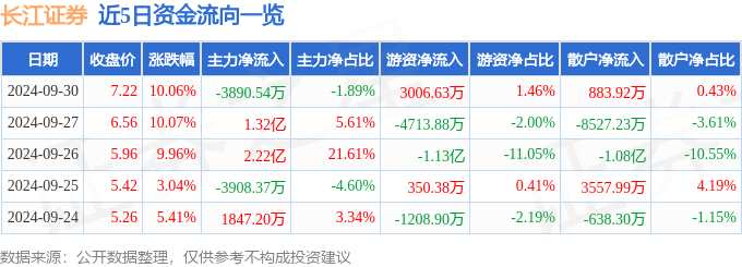 摘要: 消息,長(zhǎng)江證券9月30日漲停收盤,收盤價(jià)7.22元。該股于9點(diǎn)31分漲停,11次打開漲停,截止收盤封單資金為1.06億元,占其流通市值0.26%。9月30日的資金流向數(shù)據(jù)方面,