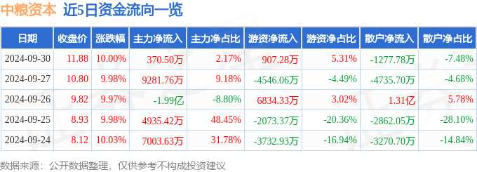 消息,中糧資本9月30日漲停收盤,收盤價11.88元。該股于9點25分漲停,未打開漲停,截止收盤封單資金為1.72億元,占其流通市值0.63%。