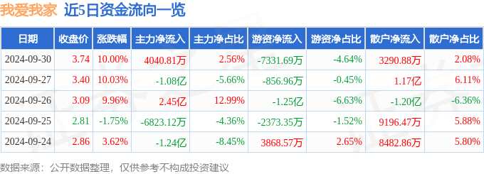 摘要: 消息,我愛(ài)我家9月30日漲停收盤,收盤價(jià)3.74元。該股于9點(diǎn)25分漲停,7次打開(kāi)漲停,截止收盤封單資金為2308.35萬(wàn)元,占其流通市值0.27%。9月30日的資金流向數(shù)據(jù)方面,