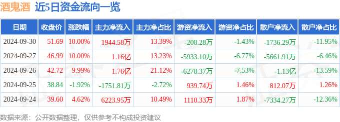 摘要: 消息,酒鬼酒9月30日漲停收盤,收盤價(jià)51.69元。該股于9點(diǎn)25分漲停,未打開漲停,截止收盤封單資金為2.03億元,占其流通市值1.21%。9月30日的資金流向數(shù)據(jù)方面,
