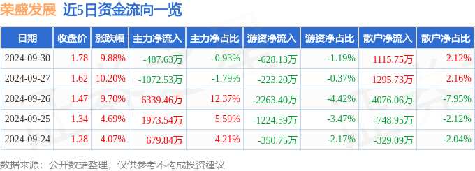 摘要: 消息,榮盛發(fā)展9月30日漲停收盤,收盤價1.78元。該股于9點25分漲停,3次打開漲停,截止收盤封單資金為2050.81萬元,占其流通市值0.3%。9月30日的資金流向數(shù)據(jù)方面,