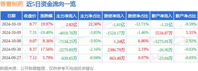 摘要: 消息,香雪制藥10月10日漲停收盤,收盤價8.77元。該股于9點42分漲停,6次打開漲停,截止收盤封單資金為6663.45萬元,占其流通市值1.16%。10月10日的資金流向數(shù)據(jù)方面,
