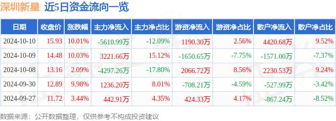摘要: 消息,深圳新星10月10日漲停收盤(pán),收盤(pán)價(jià)15.93元。該股于9點(diǎn)32分漲停,4次打開(kāi)漲停,截止收盤(pán)封單資金為1740.48萬(wàn)元,占其流通市值0.63%。10月10日的資金流向數(shù)據(jù)方面,