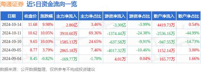 消息,海通證券10月14日漲停收盤,收盤價11.68元。該股于9點25分漲停,11次打開漲停,截止收盤封單資金為3917.28萬元,占其流通市值0.03%。
