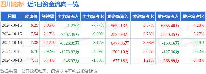 摘要: 消息,四川路橋10月16日漲停收盤,收盤價(jià)8.29元。該股于9點(diǎn)31分漲停,7次打開漲停,截止收盤封單資金為1.93億元,占其流通市值0.35%。10月16日的資金流向數(shù)據(jù)方面,