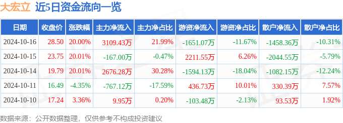 摘要: 消息,大宏立10月16日漲停收盤,收盤價28.5元。該股于9點30分漲停,未打開漲停,截止收盤封單資金為1.21億元,占其流通市值6.26%。10月16日的資金流向數(shù)據(jù)方面,