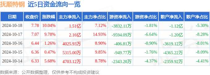 消息,撫順特鋼10月18日漲停收盤,收盤價(jià)7.78元。該股于13點(diǎn)19分漲停,16次打開(kāi)漲停,截止收盤封單資金為134.74萬(wàn)元,占其流通市值0.01%。