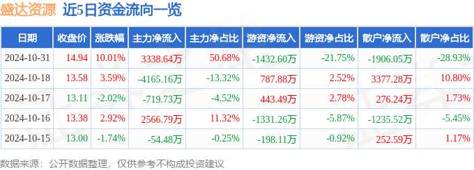 消息,盛達(dá)資源10月31日漲停收盤,收盤價(jià)14.94元。該股于9點(diǎn)25分漲停,未打開漲停,截止收盤封單資金為2.04億元,占其流通市值2.16%。