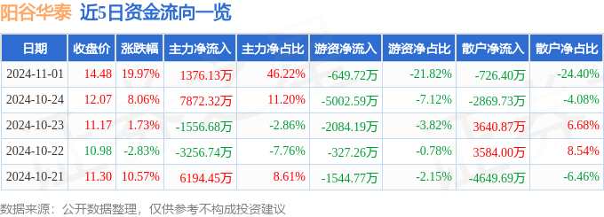 摘要: 消息,陽(yáng)谷華泰11月1日漲停收盤,收盤價(jià)14.48元。該股于9點(diǎn)25分漲停,未打開(kāi)漲停,截止收盤封單資金為6.12億元,占其流通市值10.72%。11月1日的資金流向數(shù)據(jù)方面,