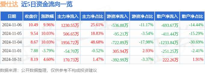摘要: 消息,愛仕達11月6日漲停收盤,收盤價10.49元。該股于9點25分漲停,未打開漲停,截止收盤封單資金為5523.88萬元,占其流通市值1.77%。11月6日的資金流向數(shù)據(jù)方面,