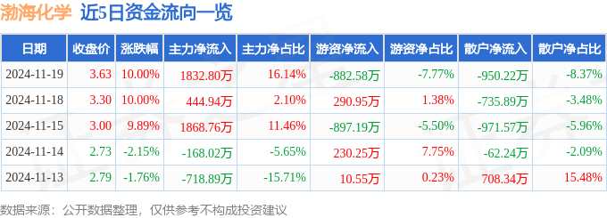 摘要: 消息,渤?;瘜W(xué)11月19日漲停收盤,收盤價(jià)3.63元。該股于9點(diǎn)31分漲停,未打開漲停,截止收盤封單資金為6618.16萬元,占其流通市值1.64%。11月19日的資金流向數(shù)據(jù)方面,
