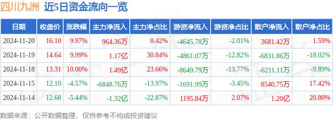 摘要: 消息,四川九洲11月20日漲停收盤,收盤價(jià)16.1元。該股于9點(diǎn)25分漲停,7次打開漲停,截止收盤封單資金為2.65億元,占其流通市值1.61%。11月20日的資金流向數(shù)據(jù)方面,