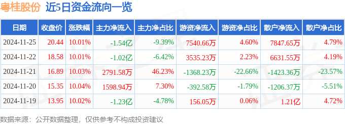 消息,粵桂股份11月25日漲停收盤,收盤價20.44元。該股于9點25分漲停,6次打開漲停,截止收盤封單資金為3.3億元,占其流通市值3.56%。