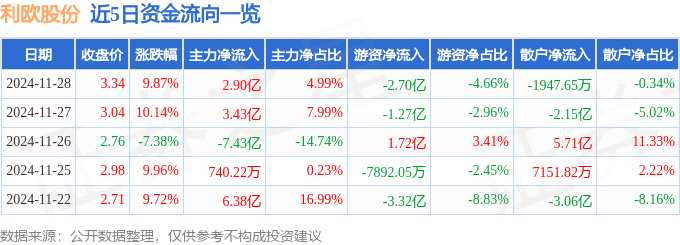 摘要: 消息,利歐股份11月28日漲停收盤,收盤價(jià)3.34元。該股于9點(diǎn)30分漲停,7次打開漲停,截止收盤封單資金為2.17億元,占其流通市值1.11%。11月28日的資金流向數(shù)據(jù)方面,