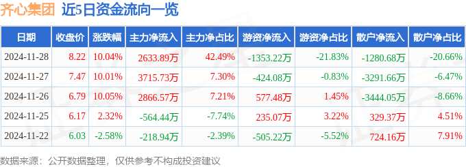 消息,齊心集團11月28日漲停收盤,收盤價8.22元。該股于9點25分漲停,未打開漲停,截止收盤封單資金為1.82億元,占其流通市值3.08%。