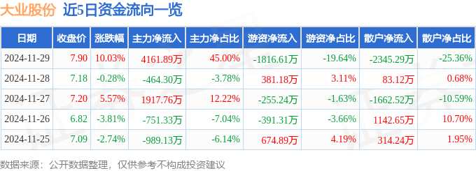 消息,大業(yè)股份11月29日漲停收盤,收盤價(jià)7.9元。該股于9點(diǎn)30分漲停,未打開漲停,截止收盤封單資金為4340.23萬元,占其流通市值1.61%。