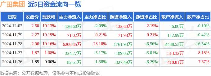 消息,廣田集團12月2日漲停收盤,收盤價2.5元。該股于9點25分漲停,未打開漲停,截止收盤封單資金為1.13億元,占其流通市值1.2%。