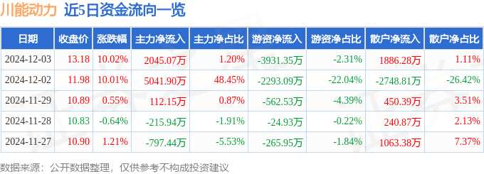 摘要: 消息,川能動(dòng)力12月3日漲停收盤(pán),收盤(pán)價(jià)13.18元。該股于9點(diǎn)25分漲停,5次打開(kāi)漲停,截止收盤(pán)封單資金為9549.16萬(wàn)元,占其流通市值0.56%。12月3日的資金流向數(shù)據(jù)方面,
