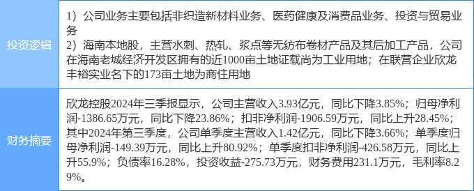 消息,欣龍控股12月3日漲停收盤,收盤價5.79元。該股于9點25分漲停,未打開漲停,截止收盤封單資金為1.6億元,占其流通市值5.15%。