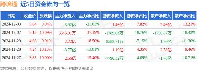 消息,跨境通12月3日漲停收盤,收盤價5.64元。該股于9點25分漲停,5次打開漲停,截止收盤封單資金為2.09億元,占其流通市值2.6%。