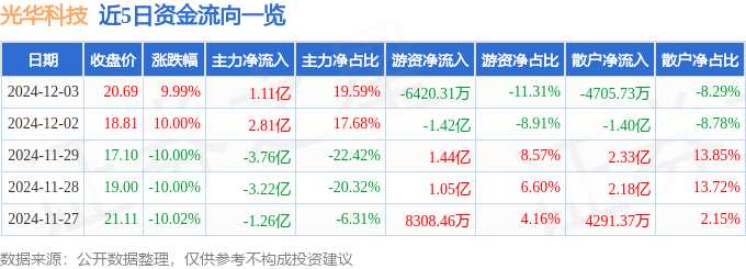 消息,光華科技12月3日漲停收盤,收盤價20.69元。該股于9點25分漲停,未打開漲停,截止收盤封單資金為2.28億元,占其流通市值3.04%。