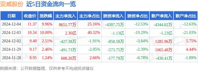 摘要: 消息,亞威股份12月4日漲停收盤,收盤價11.37元。該股于9點25分漲停,未打開漲停,截止收盤封單資金為2.87億元,占其流通市值5.05%。12月4日的資金流向數(shù)據(jù)方面,