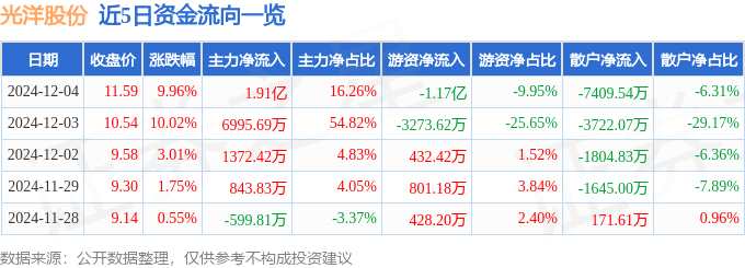 摘要: 消息,光洋股份12月4日漲停收盤,收盤價11.59元。該股于9點25分漲停,5次打開漲停,截止收盤封單資金為1.04億元,占其流通市值1.82%。12月4日的資金流向數(shù)據(jù)方面,