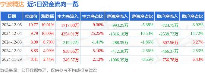 消息,寧波精達12月5日漲停收盤,收盤價10.77元。該股于9點30分漲停,未打開漲停,截止收盤封單資金為9448.87萬元,占其流通市值2.01%。