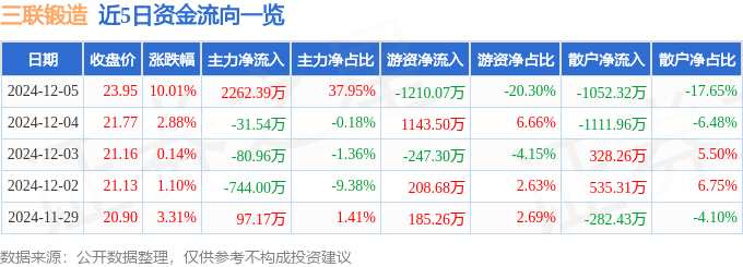 摘要: 消息,三聯(lián)鍛造12月5日漲停收盤(pán),收盤(pán)價(jià)23.95元。該股于9點(diǎn)25分漲停,未打開(kāi)漲停,截止收盤(pán)封單資金為9187.53萬(wàn)元,占其流通市值6.87%。12月5日的資金流向數(shù)據(jù)方面,