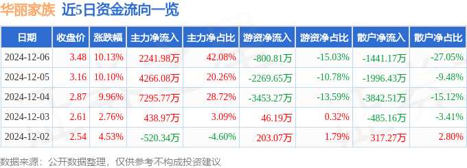 摘要: 消息,華麗家族12月6日漲停收盤,收盤價(jià)3.48元。該股于9點(diǎn)25分漲停,未打開漲停,截止收盤封單資金為2.65億元,占其流通市值4.76%。12月6日的資金流向數(shù)據(jù)方面,