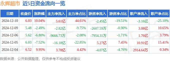 摘要: 消息,永輝超市12月10日漲停收盤,收盤價(jià)6.03元。該股于9點(diǎn)25分漲停,未打開漲停,截止收盤封單資金為5.58億元,占其流通市值1.02%。12月10日的資金流向數(shù)據(jù)方面,