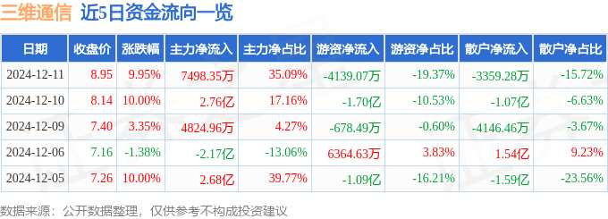 消息,三維通信12月11日漲停收盤,收盤價8.95元。該股于9點25分漲停,未打開漲停,截止收盤封單資金為2.68億元,占其流通市值3.99%。