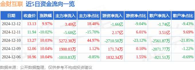 摘要: 消息,金財互聯(lián)12月12日漲停收盤,收盤價13.13元。該股于9點(diǎn)25分漲停,1次打開漲停,截止收盤封單資金為4.08億元,占其流通市值4.47%。12月12日的資金流向數(shù)據(jù)方面,