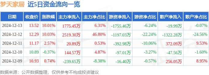 摘要: 消息,夢天家居12月13日漲停收盤,收盤價(jià)13.52元。該股于9點(diǎn)31分漲停,12次打開漲停,截止收盤封單資金為1714.88萬元,占其流通市值2.24%。12月13日的資金流向數(shù)據(jù)方面,