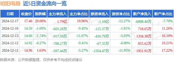 消息,明陽(yáng)電路12月17日漲停收盤(pán),收盤(pán)價(jià)17.4元。該股于10點(diǎn)0分漲停,6次打開(kāi)漲停,截止收盤(pán)封單資金為3529.94萬(wàn)元,占其流通市值0.67%。
