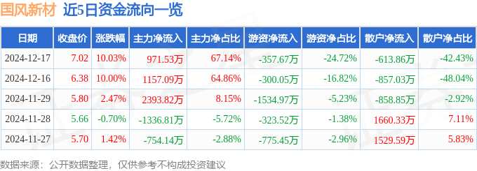 消息,國風(fēng)新材12月17日漲停收盤,收盤價7.02元。該股于9點25分漲停,未打開漲停,截止收盤封單資金為3.83億元,占其流通市值6.09%。
