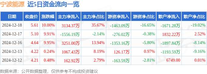消息,寧波能源12月18日漲停收盤,收盤價(jià)5.61元。該股于9點(diǎn)25分漲停,未打開漲停,截止收盤封單資金為2.19億元,占其流通市值3.5%。