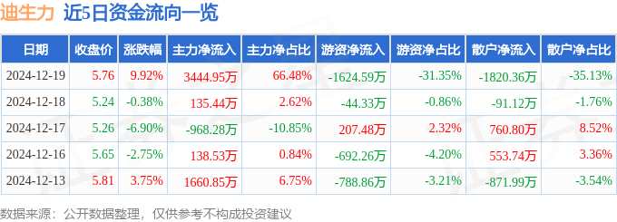 消息,迪生力12月19日漲停收盤,收盤價5.76元。該股于9點(diǎn)33分漲停,未打開漲停,截止收盤封單資金為2245.25萬元,占其流通市值0.91%。