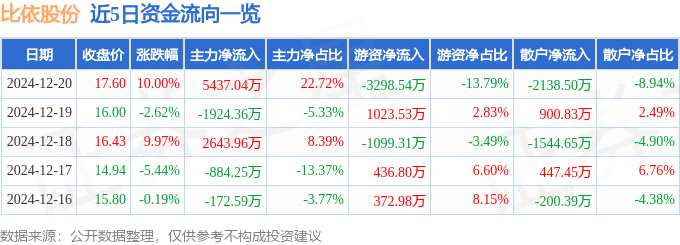 摘要: 消息,比依股份12月20日漲停收盤,收盤價17.6元。該股于9點41分漲停,未打開漲停,截止收盤封單資金為5311.57萬元,占其流通市值4.25%。12月20日的資金流向數(shù)據(jù)方面,