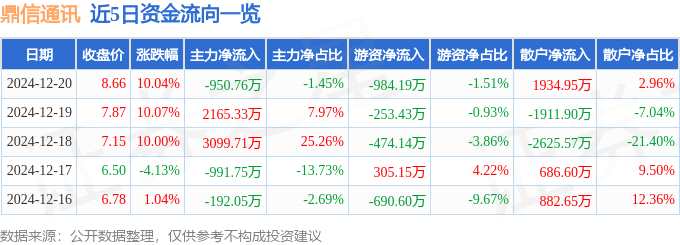 摘要: 消息,鼎信通訊12月20日漲停收盤,收盤價8.66元。該股于9點30分漲停,5次打開漲停,截止收盤封單資金為4212.6萬元,占其流通市值0.75%。12月20日的資金流向數(shù)據(jù)方面,