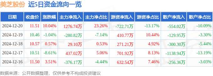 消息,美芝股份12月20日漲停收盤(pán),收盤(pán)價(jià)11.51元。該股于9點(diǎn)25分漲停,未打開(kāi)漲停,截止收盤(pán)封單資金為1.95億元,占其流通市值13.98%。