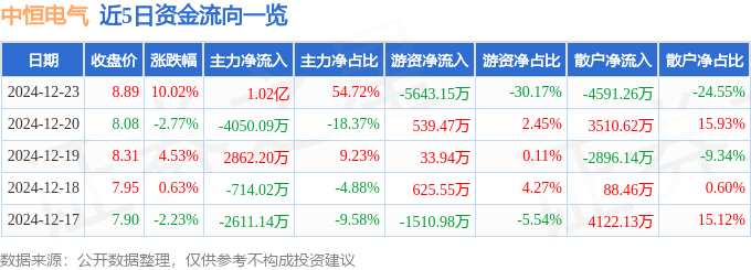 消息,中恒電氣12月23日漲停收盤,收盤價8.89元。該股于9點31分漲停,未打開漲停,截止收盤封單資金為5265.64萬元,占其流通市值1.06%。